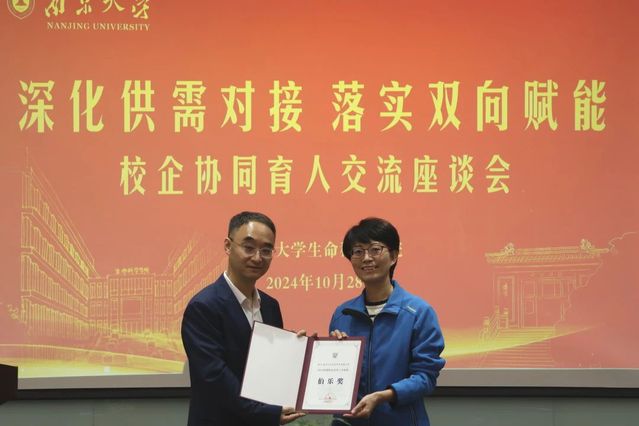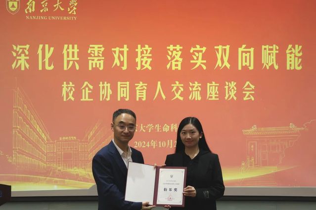 纪勇书记在开场致辞中对各位企业的到来表示欢迎,期待能共同探讨校企合作人才培养新机制。纪书记特别提到,今年是公司连续第十一年举办生物医药行业专场招聘会。这不仅是一个数字的积累,更是公司与企业之间深厚合作关系的见证。为表达对企业的感激之情,公司设立“校企合作人才培养伯乐奖”。公司副经理董磊宣读太阳成集团tyc33455cc2023年度校企合作人才培养伯乐奖授予决定,授予八家企业“校企合作人才培养伯乐奖”称号,分别是:先声药业集团、南京金斯瑞生物科技有限公司、江苏集萃药康生物科技股份有限公司、南京汉欣医药科技有限公司、南京优科生物医药股份有限公司、南京亿高医疗科技股份有限公司、南京健友生化制药股份有限公司、苏州一兮生物技术有限公司。纪勇书记为到会企业代表颁发证书。