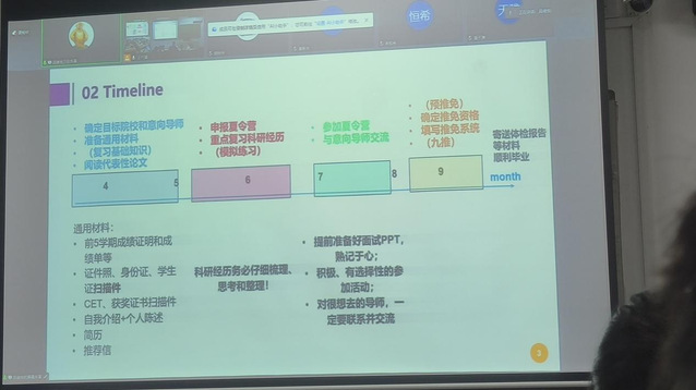 雷天雅和潘钰琦同学分享了大学三年成绩稳步提升的学习历程。他们首先让大家不要焦虑,梳理好时间线才能有规划有准备地进行保研申请,广撒网的同时细心关注保研事项,详细解析了保研、夏令营等时间线及主要公司的保研情况。雷天雅同学详细介绍了保研南大的各项细节,对于现场的大多同学都受益匪浅。潘钰琦同学指出要着重提升个人英语口语交流和英文文献阅读能力,而这两项能力的提升都离不开日常的积累。