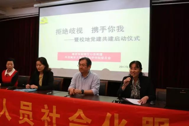 5月8日上午9:00(世界红十字日、世界微笑日)南京老员工命科学公司党委与鼓楼区小市街道党委校地党建共建启动仪式在小市街道东井亭社区顺利举行。生科公司党委书记卢山教授、副书记焦瑞华副教授、党委秘书、辅导员、研究生党员20多人走进东井亭社区,携手街道王翠凤主任、社区书记陈玉梅以及80多名社区银发党员,以“拒绝歧视 携手你我 微笑社区行”的主题党日活动,共度“世界微笑日”。