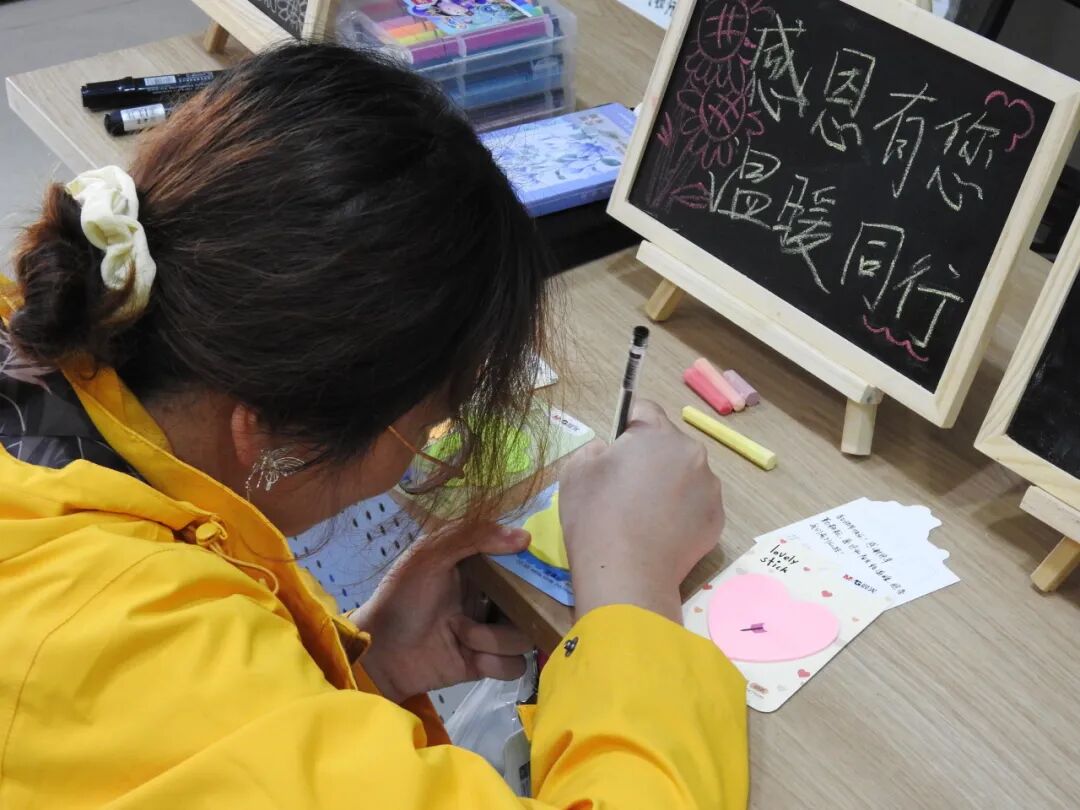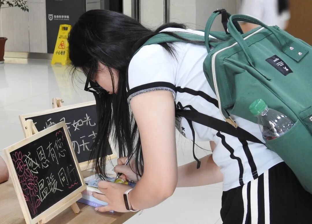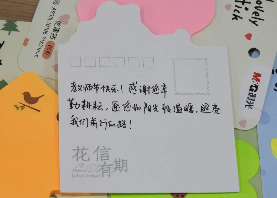 同时,许多同学在承载心意的定制贺卡上写下专属祝福。有的同学低头沉思片刻,似在回忆课堂上老师耐心答疑的瞬间,又或是科研中老师悉心指导的画面;有的同学则提笔疾书,笔尖在卡片上沙沙作响,仿佛要将满腔感激都倾注于文字之中。所有难以当面言说的感谢与敬意,都化作卡片上一笔一划的真挚文字,成为留给老师们独一无二的节日纪念。