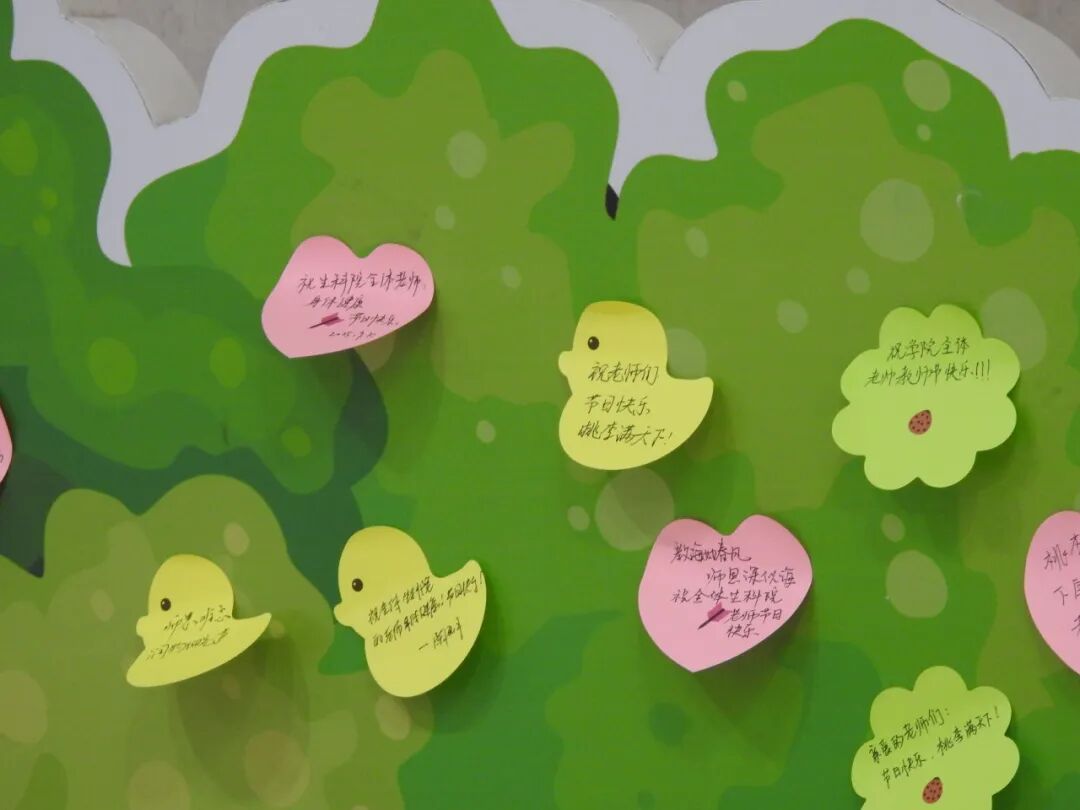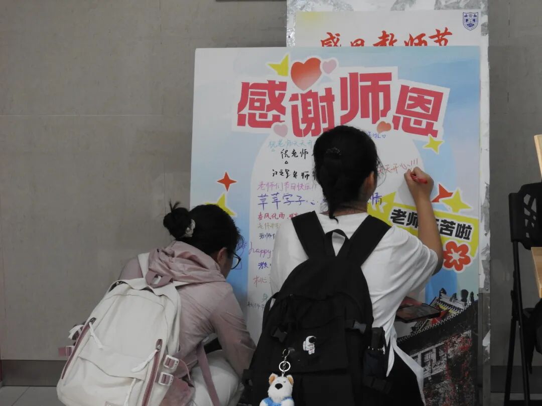 一楼的留言板与便签墙,更成为活动的亮眼之处。留言板上,有人以诗句传情——“教泽如海育桃李,师恩似阳暖人心”;也有人留下朴素真挚的祝福——“祝老师天天开心,事事如愿”……旁边的便签墙则贴满五颜六色的便利贴,内容朴实却动人:“祝老师教师节快乐,学术长青”“祝老师们新学期万事胜意,工作顺利”…… 密密麻麻的便签如同绽放的小花,将对老师的祝福一一记录,绘成一幅满溢爱意的“感恩画卷”。