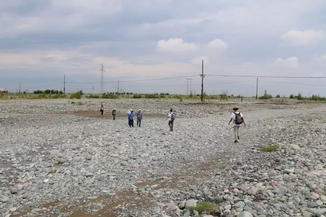 第二日的行程依旧以水为主题,团队先是来到弱水花海附近的黑河河畔。此处有桥,桥下即为黑河。横跨过桥,两岸相对,相距甚远,足见涨水期黑河河面在此处之宽。然而,事实上,在这个季节,河面非常窄,汇集于桥下一侧,却可见水流十分湍急。携带着大量泥沙的祁连山脉融水奔涌而来,打磨着岸边的石头,又匆匆而去。桥下除去流水以外,均为河漫滩,布满卵石。这些石头被湍急的河水从祁连山上冲下,又被打磨得光滑圆润。带队的刘茂松老师曾进行过地质学学习,一路上向队员们传授了不少石头质地方面的知识。黑河的水文特征蕴藏了太多关于生态的秘密,而实地考察黑河的水流特征又无疑促进了团队对于河流生态的了解。