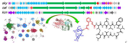 微生物来源的非核糖体肽类化合物(nonribosamal peptides, NRPs)具有结构复杂、活性广泛的特点,是抗菌,抗炎,免疫抑制,抗病毒等药物的重要来源,代表化合物有环孢菌素A,万古霉素,达托霉素等等。其中许多非核糖体肽类化合物的N端有着不同程度的修饰,这对于保护N端不被降解或调节特定性质是很重要的。因此,从细菌基因组中挖掘N端含稀有基团的非核糖体肽类的潜在的生物合成基因簇并对这些基因簇进行激活是发现 新型活性肽类的有效手段。