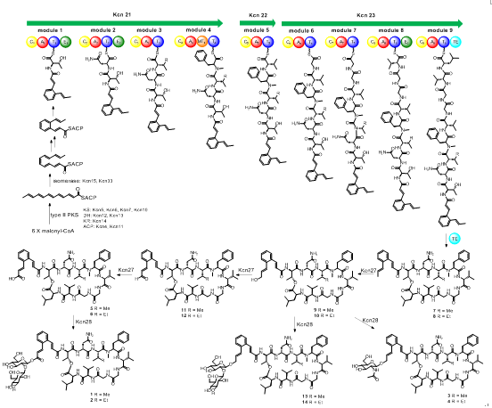 进一步通过基因敲除、体外生化反应并结合蛋白晶体结构揭示了其生物合成过程:首先三个NPRS合成酶Kcn21、22、23负责识别并装载特定的氨基酸形成九肽骨架,在硫酯酶结构域作用下从装配线上水解下来;接着P450单加氧酶Kcn27催化连续的三步氧化,将肉桂酰基团的末端从-CH3 氧化成-COOH;由糖基转移酶Kcn28催化肉桂酰基团上的糖基化反应,最终形成糖肽类化合物1 、2 、3 、4 、13 和14 。Kcn28具有底物宽泛性,不仅能在末端是-COOH的化合物5 和6 上转移两分子的葡萄糖,还能在末端是-OH的中间体9 和10 上转移一分子乙酰葡萄糖胺或两分子葡萄糖。