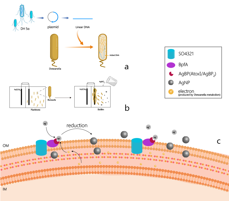 煤炭、石油和天然气等化石燃料的燃烧为全球变暖贡献了大量的温室气体。全球性的气候危机已经成为当前人类不可忽视的重大议题。今年,Nanjing-China团队注意到微生物燃料电池(MFC)是一种能将有机物中的化学能转化为电能的新型可再生能源。但MFC目前面临的主要问题是发电功率不理想。因此,团队将银离子结合蛋白引入希瓦氏菌的膜表面。工程希瓦氏菌可以合成并富集银纳米颗粒,从而促进电子转移、增大生物膜厚度,有效提高发电功率密度。
