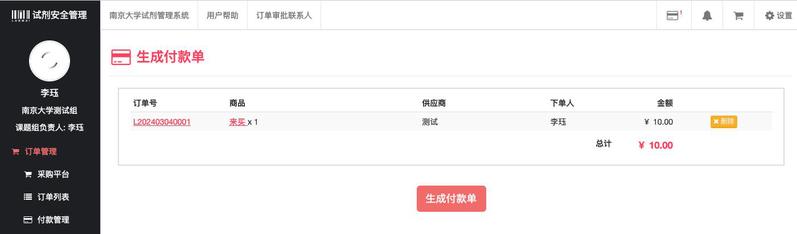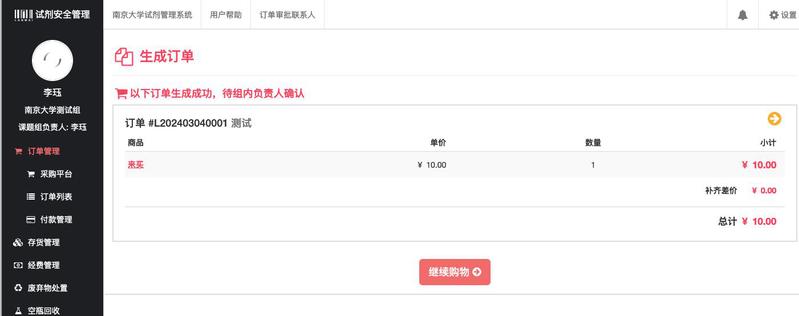【订单列表】,根据订单类型,订单状态显示为【待审核】,等待院系管理员-院系领导两级审核。如订单无需审核,订单状态更新为【待付款】;