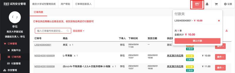 8.1 订单列表,点击【待付款已到货】订单【操作】付款,选择【加入付款夹】,该订单自动加入付款夹中(仅课题组负责人或有付款权限的老师可操作)。如图所示: