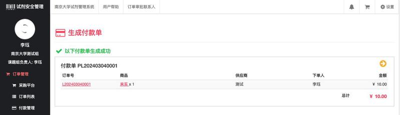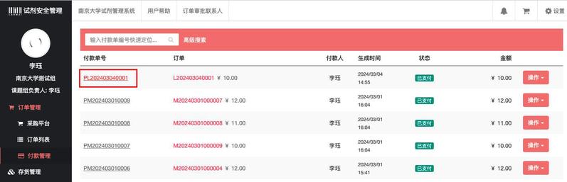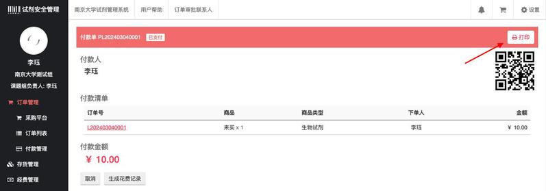 8.3【付款管理】,找到PL 开头的付款单,此时付款单状态为【已支付】,点击付款单单号,即可显示付款单详情。确认无误后点击右上角【打印】按钮,可打印入库单(结算单)用于线下报销;