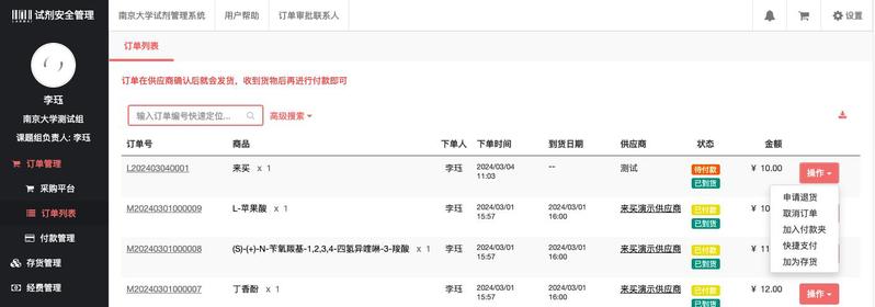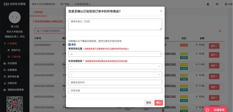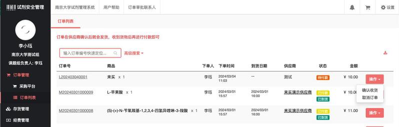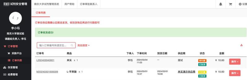 【订单列表】,点击“待付款”订单右侧【操作】,选择【确认收货】,仅课题组负责人或有确认订单权限的老师操作(非下单人);此时订单状态更新为“待付款已到货”;