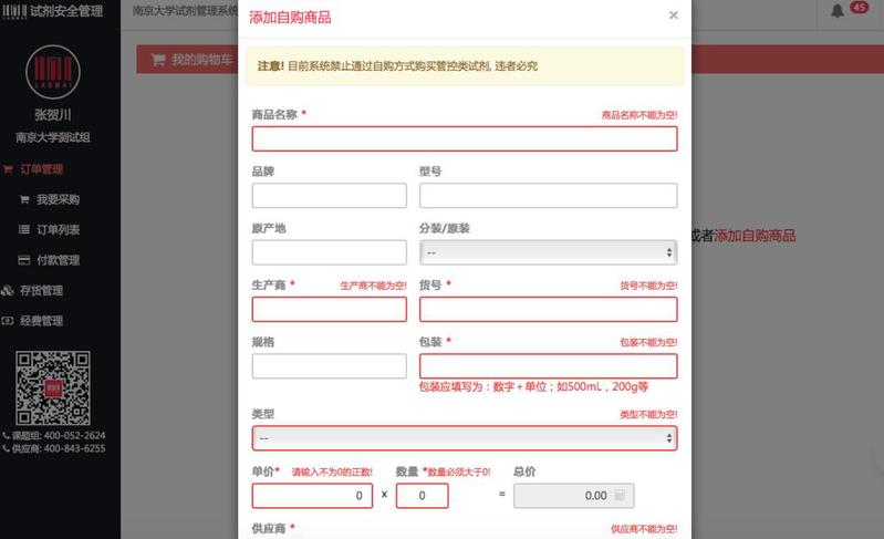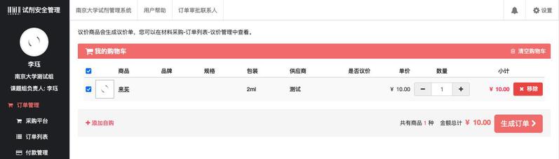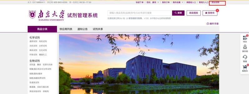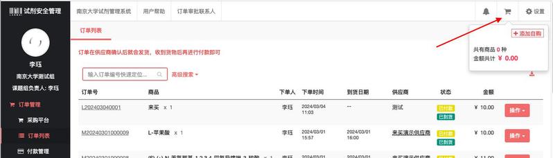 入口一:通过“课题组入口”登录,进入后点击右上角“购物车”,选择“添加自购”。