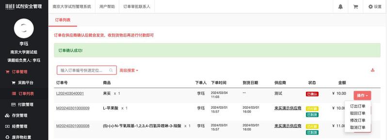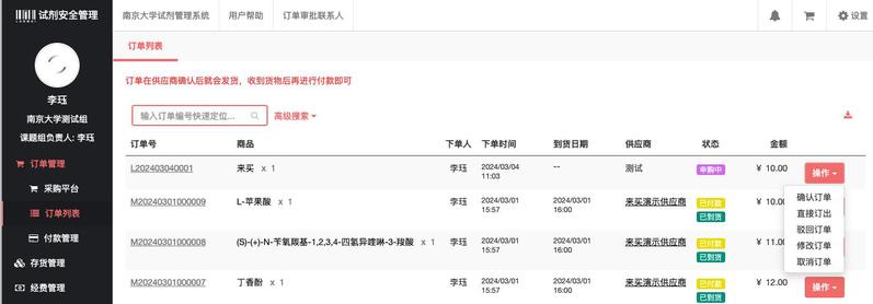 【订单列表】,点击“已确认”订单右侧【操作】,选择【订出订单】,仅课题组负责人或有订出订单权限的老师操作;