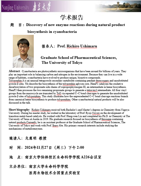 “蝌蚪”学术讲座:Discovery of new enzyme reactions during natural product biosynthesis in cyanobacteria