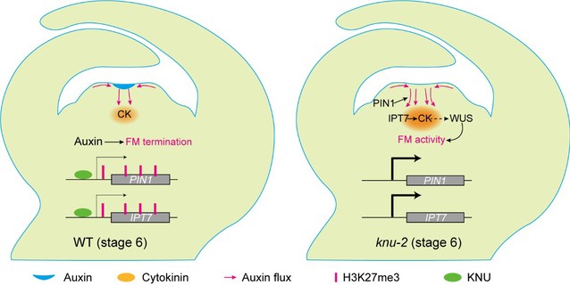 近日,太阳成集团tyc33455cc孙博课题组揭示了拟南芥中KNU蛋白通过调控生长素和细胞分裂素的分布与活性,以实现FM适时终止的分子机制。研究表明,在花发育早期,KNU介导的生长素和细胞分裂素在FM中的动态分布对于其适时终止至关重要。通过对knu-2突变体及相关转基因植株的表型分析,结合分子生物学和细胞生物学实验,发现KNU能够直接结合并抑制生长素转运基因PIN-FORMED1(PIN1)和细胞分裂素合成基因ISOPENTENYLTRANSFERASE7(IPT7)的表达。进一步的实验结果表明,KNU通过介导这些基因位点上抑制性组蛋白修饰H3K27me3的生成,来调控生长素和细胞分裂素的活性。此外,pKNU:PIN1和pKNU:IPT7两种转基因材料显示出与knu-2突变体类似的异位心皮,而knu-2 ipt7和knu-2 pin1-1双重突变体则明显回复了knu-2突变体的异位心皮表型,表明KNU可通过PIN1和IPT7调控FM的适时终止。以上发现为深入理解花发育的分子调控机制提供了新的视角。