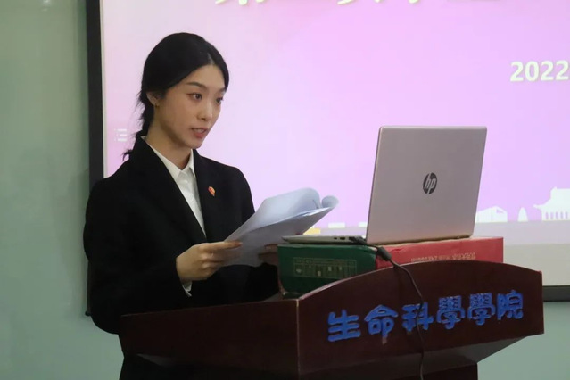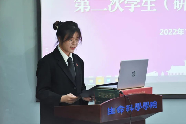 丁宇代表校团委讲话。丁宇老师希望在今后的工作中能与生科院员工会、研究生会继续增进沟通、加强协作,在员工会、研究生会组织深化改革的浪潮中携手同行,并鼓励同学们弘扬伟大建党精神、自信自强、守正创新、踔厉奋发、勇毅前行,努力成长为有理想、敢担当、能吃苦、肯奋斗的新时代青年。
