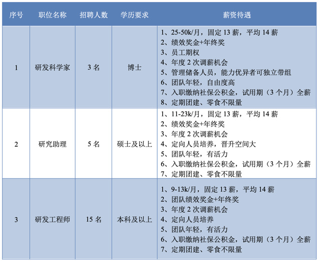 公司现有员工2500+人,硕士及以上学历600+人,取得博士学位近100人。公司为员工提供极富竞争力的薪酬,以及公平的职业发展机会,鼓励和帮助员工快速成长;尊重个性,为每位员工提供适合自己的发展路径。
