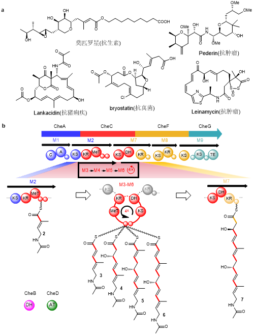 图a、优良活性的trans-AT聚酮分子;b、trans-AT聚酮合酶CheC的特殊迭代作用方式