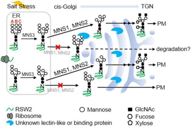 (图1)MNS1/MNS2介导的N-糖基剪切作用调节盐胁迫下RSW2/rsw2-1的稳定性和/或运输机制示意图。