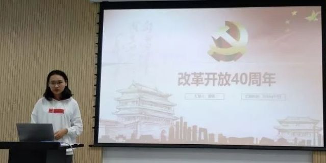 会议首先由董倩同学给大家进行汇报展示,主要目的在于带领大家一起深入学习习近平总书记关于改革开放的新思想。汇报指出,在改革开放40周年的重要节点,习近平总书记先后赴广东、上海考察,再次强调了改革开放,并向世界宣示了高举新时代改革开放旗帜、把改革开放不断推向深入的坚定意志。