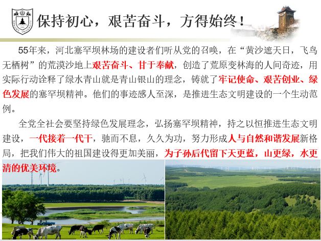 讲解临近结束时,冀艳利同志总结到:塞罕坝人铸就了“忠于使命、艰苦奋斗、科学求实、绿色发展”的塞罕坝精神,印证了“绿水青山就是金山银山”的发展思想,为加强生态文明建设提供了宝贵经验。全党全社会要坚持绿色发展理念,弘扬塞罕坝精神,持之以恒推进生态文明建设,一代接着一代干,驰而不息,久久为功,努力形成人与自然和谐发展新格局,把我们伟大的祖国建设得更加美丽,为子孙后代留下天更蓝,山更绿,水更清的优美环境。