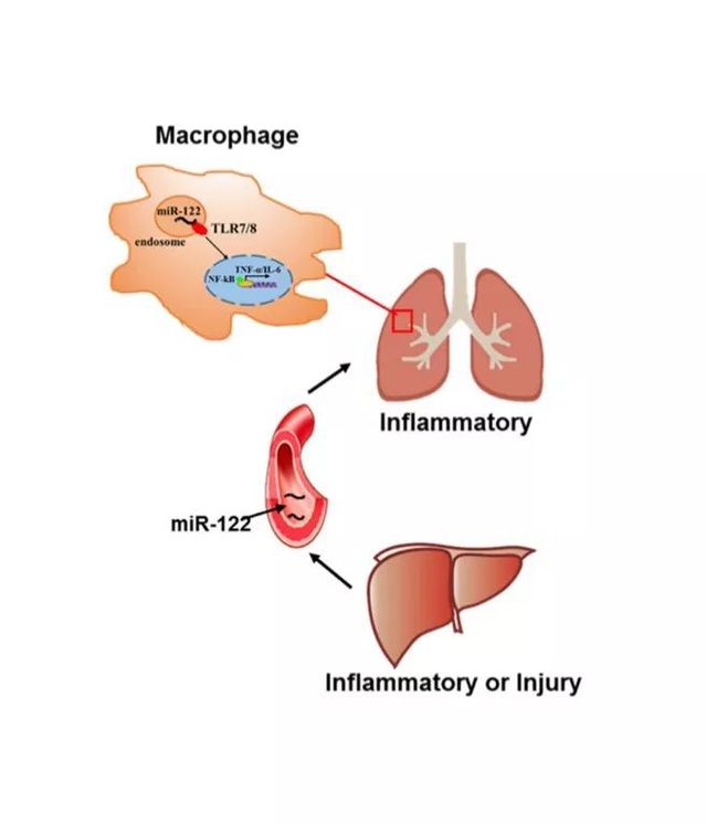 该团队研究了各种肝脏疾病(急/慢性肝炎、肝损伤、肝癌)引起肺部炎症的分子机制,发现肝脏疾病发生时,miR-122作为肝组织最特异、最丰富的miRNA,在血浆中上升最为显著,且循环系统中95%以上的miR-122是以非囊泡依赖性的形式存在。机制研究表明循环系统中的miR-122会进一步到达肺组织,通过与TLR7/8直接结合从而激活肺泡巨噬细胞,最终引起肺部炎症。该研究阐释了非囊泡依赖的游离miRNA的独特作用方式,表明游离的循环miRNA同样在机体内发挥不可忽视的病理生理作用。此外,该研究从全新角度提出肝脏疾病引起肺部炎症的发病机理,有望为临床治疗提供新思路。