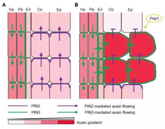 在病原菌侵染时,植物降低根部生长,使能量和物质流转向免疫反应。植物的根尖由根冠、分生区、过渡区和伸长区组成。过渡区是分裂状态的胚性细胞转向伸长状态的区域,控制着主根的伸长。通过表型分析和根部显微观察,发现PEPs(包括Pep1和 Pep2)通过PEPR2抑制主根生长,并伴随着过渡区细胞膨大和侧根增多。通过植物激素相关表型筛选,发现生长素可以模拟PEP1的生理作用。利用激光显微镜分析携带生长素敏感的分子荧光蛋白的转基因植株,发现PEP1处理导致生长素在根部过渡区的表皮和皮层细胞过度积累。由于生长素的区域化分布依赖于其转运体PINs家族的特定成员,该文章分析多个pin突变体植株,发现pin2突变体对Pep1表现出超敏感,而pin3突变体为耐性的生长表型。但是, pin2 pin3 双突变体表现出与野生型植株相类似的Pep1反应,表明PIN2降低,而PIN3促进Pep1处理所导致的根生长抑制。为了探讨这两种生长素转运体为何表现出的相反功能,该文章利用植物分子遗传学、药理学方法和荧光标记蛋白显微观察等方法,发现Pep1激活位于过渡区表皮和皮层细胞的质膜上PIN2蛋白的脱膜运输,并促进PIN3的合成,从而降低PIN2而促进PIN3在该根部区域表皮和皮层细胞的质膜上的蛋白丰度。根据PIN2(介导根尖分生区的生长素通过过渡区向伸长区的运输)和PIN3(介导地上部生长素通过根部中心内皮和薄层细胞向根尖运输)的生长素转运功能,该文章认为,Pep1降低PIN2导致原流向伸长区的生长素滞留在过渡区,而提高PIN3导致原流向根尖的生长素分流到过渡区,协同提高过渡区生长素的含量以抑制过渡区的细胞活性,从而降低根部生长(见下图)。
