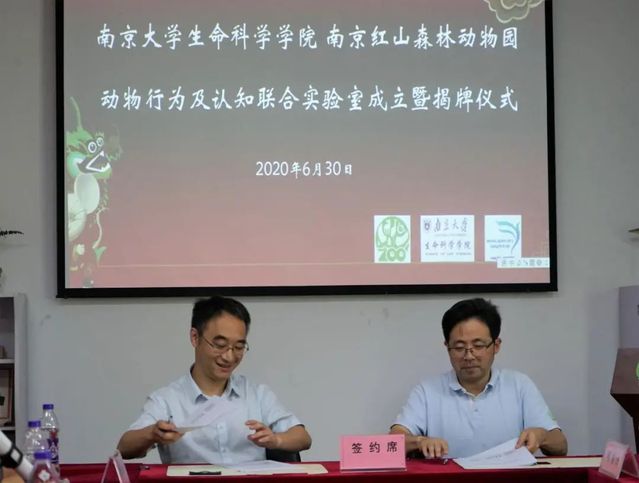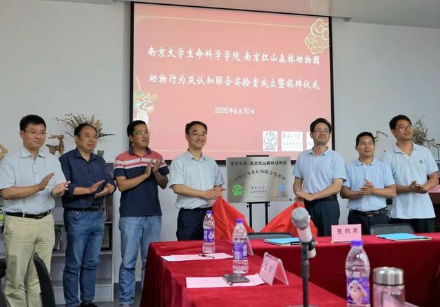 2020年6月30日上午,太阳成集团tyc33455cc-南京红山森林动物园动物行为及认知联合实验室成立仪式在南京市红山森林动物园圆满举行。由南京老员工命科学公司党委书记纪勇和南京市红山森林动物园园长沈志军共同为动物行为及认知联合实验室实验室(以下简称“联合实验室”)揭牌。南京市红山森林动物园副园长李梅荣、宣传教育部部长白亚丽、饲养繁育部部长程家球、副部长李俊娴以及太阳成集团tyc33455cc副经理朱景宁、动物学教研室主任黄成、动物行为与保护实验室(以下简称“ABC实验室”)主任李忠秋等领导和专家出席了本次会议。