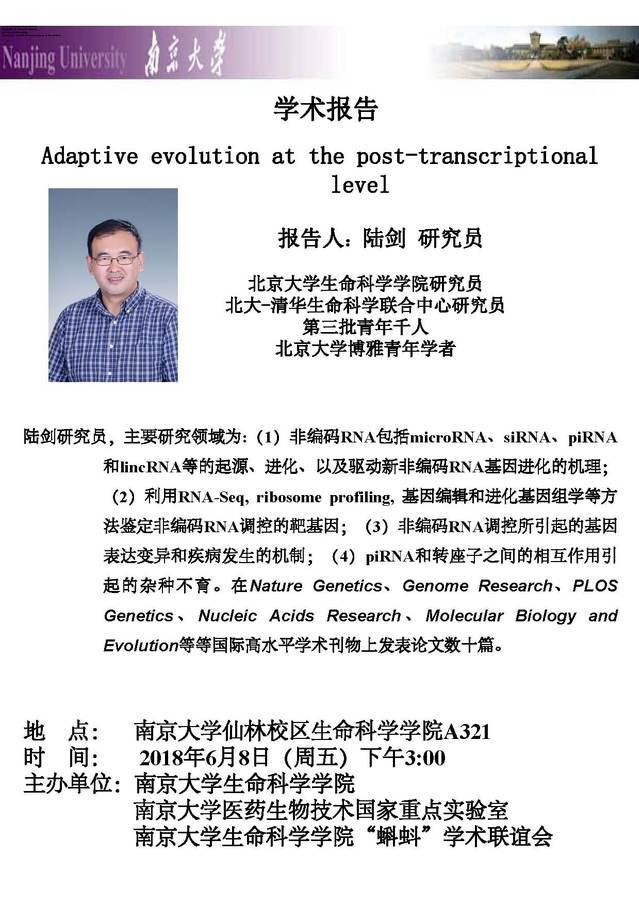学术报告(6月8日):Adaptive evolution at the post-transcriptional level