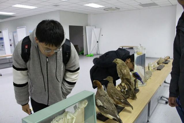 结束了实验室参观的同学们来到了生科楼二楼标本室。标本室早早陈列好精彩的学术海报与类型丰富的生物样本。