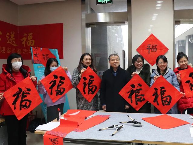 活动现场,长桌排开,笔墨铺就,在老师同学们的围观下,在一声高过一声的“我也想要一个福字”“请您来个对联吧”的热情中,徐强老师拿起毛笔,在纸上挥毫泼墨,写下了一幅幅饱含着浓浓年味、寓意幸福的新春对联和“福”字。作品一“出炉”,就被在场老师同学迫不及待地“抢”走了。一张张“福”字在大家手上传递,红彤彤的春联映衬着笑脸,浓浓墨香下洋溢着节日的喜庆。