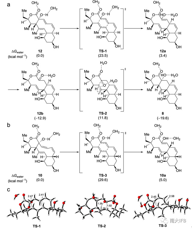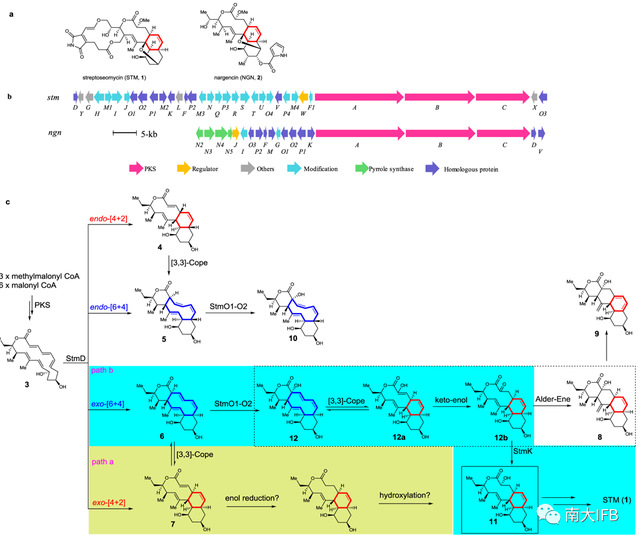基于以上结果,研究者对6到11的生物合成过程进行了推测:StmO1-O2直接氧化6中sp3杂化的C2原子,生成化合物12,经Cope重排迅速生成12a,再经烯酮异构变成12b(Fig. 1c,path b)。此时,若StmK存在,12b会被还原产生中间体11。而当StmK不存在时,12b会经Alder-ene反应自发生成支路产物8。