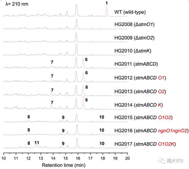 既然无法直接从stmABCDO1O2菌株中获取中间体,研究者猜想是否向其再导入下游基因就能捕获中间体,得到稳定的化合物。于是他们导入了NAD(P)H依赖的还原酶stmK,果然检测到额外的新峰11(Fig. 2)。通过核磁数据研究人员确证11具有与终产物一致的10/6/6三环骨架,饲喂实验也表明11能够恢复1的产生。以上数据表明只需stmABCDO1O2K七个基因就足够产生中间体11。