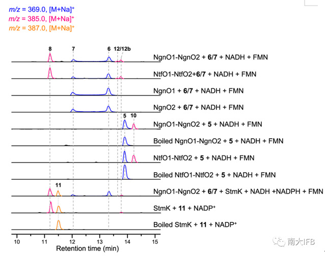 Fig. 3: LC-MSanalysis of NgnO1-NgnO2, StmK, and NtfO1–NtfO2 catalyzed reaction.