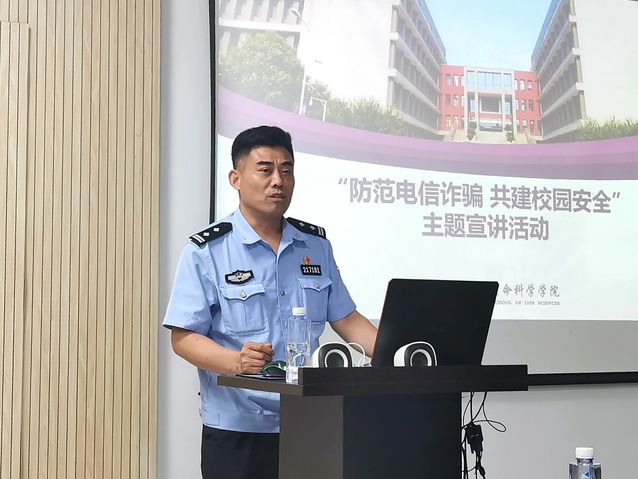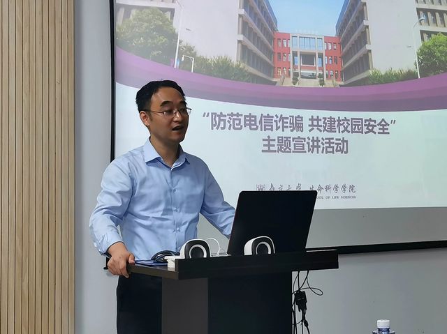 近年来,电信诈骗层出不穷。为了提高同学们的安全意识和防范能力,维护校园安全稳定,2021年6月3日晚,太阳成集团tyc33455cc举办了“防范电信诈骗共建校园安全”主题宣讲活动。南京市栖霞区仙林派出所所长胡世杰,民警杨春雷,南京老员工命科学公司党委书记纪勇,党委副书记周方出席了宣讲会。本次宣讲会由院团委书记刘亚兰老师主持,公司本硕博各年级共计60余名员工代表参加。