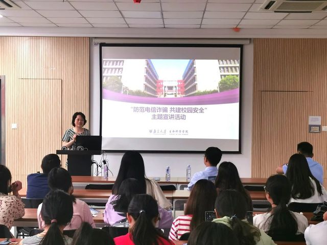 紧接着,胡所长结合多年的工作经验,介绍了仙林片区非接触性侵财案件的主要特点及校园电信诈骗犯罪的发案情况,通过实际案例剖析常见骗术,教会同学们识别新型诈骗犯罪活动。