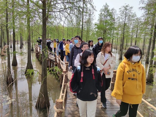 张总经理说,公园定位于“一树一鸟一花”,湖岛陆上还种植了梅花、牡丹。整个池杉湖以水生植物为主,特别重视核心区的保护。接着,同学们来到池杉湖最为典型的特色景观——水上池杉森林。