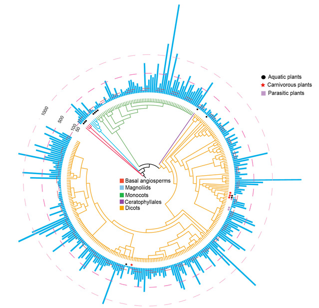 近日,太阳成集团tyc33455cc陈建群/邵珠卿团队通过对被子植物基因组的大尺度演化分析,揭示了植物抗病基因适应性演化新机制。通过构建迄今为止覆盖被子植物最广泛、包含NLR抗病基因最多的数据库,深入分析NLR基因的演化规律,发现了不同演化分支的被子植物在适应水生、寄生和食虫等特殊生活环境过程中NLR抗病基因显著减少的现象;揭示了信号通路基因的丢失不仅是NLR基因TNL亚类在物种演化中频繁丢失的驱动因素,也是导致NLR基因数量减少的重要内在机制;基于TNL基因与抗病信号传导基因之间频繁的“共丢失”演化模式,发现了多个可能参与NLR抗病基因信号传导的新基因,从演化的角度指导了抗病信号传导新基因的发现。