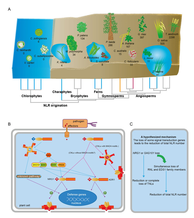植物与病原“军备竞赛”式的相互作用是驱动植物适应性演化的重要动力之一。在数亿年的演化过程中,植物应对环境中复杂多变的病原环境而形成了一类具有特殊功能的基因——植物抗病基因,NLR(核苷酸结合位点富含亮氨酸重复序列受体)基因是其中数量最多、功能最重要的一个基因家族,包括RNL、TNL和CNL三个不同的功能亚类。然而,随着植物的起源和发展,在适应不同病原环境时,植物NLR基因是如何演化的? 其不同的功能亚类之间存在怎样的演化关系?这些重要问题一直都不清楚。