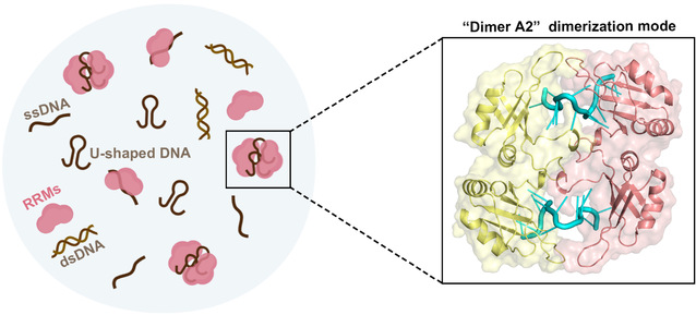 图1. DNA诱导hnRNP A2/B1二聚化的分子机制示意图