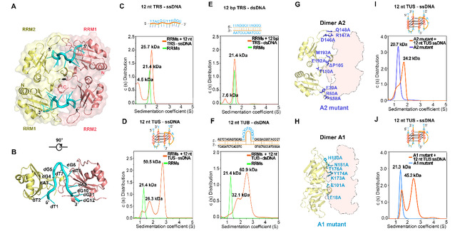 通过hnRNP A2/B1的核酸结合结构域(RRMs)与12 nt ssDNA复合物的高分辨率晶体结构,该团队人员首次发现一种独特的U型DNA构象能够介导hnRNP A2/B1形成全新的二聚化模式(图2A-B)。研究人员通过生化实验发现溶液中的hnRNP A2/B1能够结合具有U型结构的G-四链体ssDNA并形成蛋白质同源二聚体,而与线性ssDNA结合只能形成摩尔比例1:1的蛋白质核酸复合物(图2C-D)。此外,研究人员发现只有含有U型凸起的双链DNA(dsDNA)能与hnRNP A2/B1结合并诱发蛋白质二聚体的形成,缺乏凸起结构的dsDNA不能与hnRNP A2/B1结合(图2E-F)。这些结果表明DNA的U型构象在诱导hnRNP A2/B1二聚过程中发挥了关键作用。