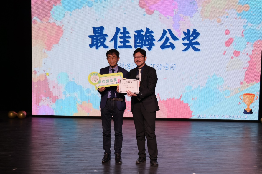公布最终比赛结果前,员工会为杨荣武老师设计了一个特殊的颁奖环节。同学们通过视频分享了与杨荣武老师的故事,表达了对老师的喜爱与祝愿。接下来,“员工代表”丁智老师为杨荣武老师献上员工授予他的“最佳生物化学导师奖”。正如丁老师所言,杨荣武老师在长达32年的教员工涯中,始终坚守教育初心,宛如神奇的催化剂,有效降低了同学们学习生物化学的“活化能”,使众多学子的人生与生物化学、与生命科学结下了不解之缘。