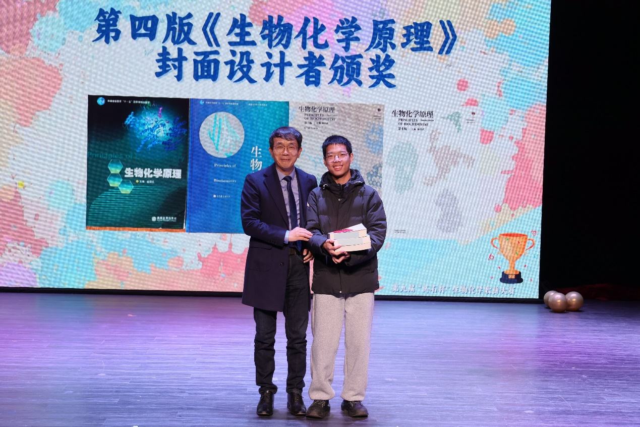 第二章节的比赛结束后,杨荣武老师为本次大赛的特邀嘉宾——第四版《生物化学原理》教材封面设计者、浙江金华第一中学的黄柯翰同学,颁发设计奖金2024元并赠送前三版《生物化学原理》教材,诚挚感谢他为第四版《生物化学原理》封面设计所付出的创意与心血。黄同学对杨荣武教授在他学习生物竞赛道路上的指引表达了感谢,特别荣幸自己所设计的作品能够被选为杨教授新版教材的正式封面,他的到来也无疑为大赛增添了一抹亮色。
