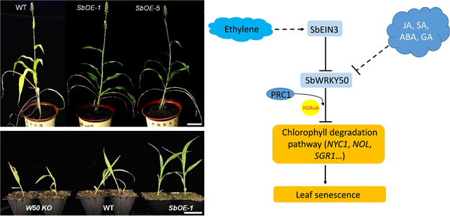 bWRKY50超表达高粱(SbOE-1, SbOE-5)、SbWRKY50敲除高粱(W50 KO)与野生型相比的植株衰老表型以及相关调控机制。