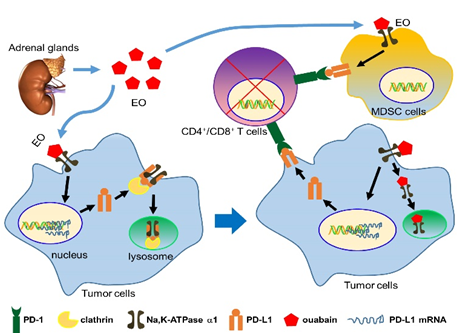 哇巴因是一种高等植物产生的抵抗昆虫入侵的化学武器,但在非小细胞肺腺癌患者血液中检测到异常高表达的EO,且EO表达量与肿瘤转移、患者预后密切相关。进一步研究发现在肺腺癌进展中,肾上腺能够被肿瘤“劫持”释放EO,进入肺腺癌微环境中的EO “巧妙”地利用钠钾ATP酶受体“脱敏”精密调控PD-L1表达,促进肿瘤免疫逃逸,成果的新颖性获得国际同行专家的高度评价。该研究拓展了EO的新生物学功能,为发现肿瘤免疫逃逸新机制、提高肺腺癌免疫治疗效果提供理论依据。