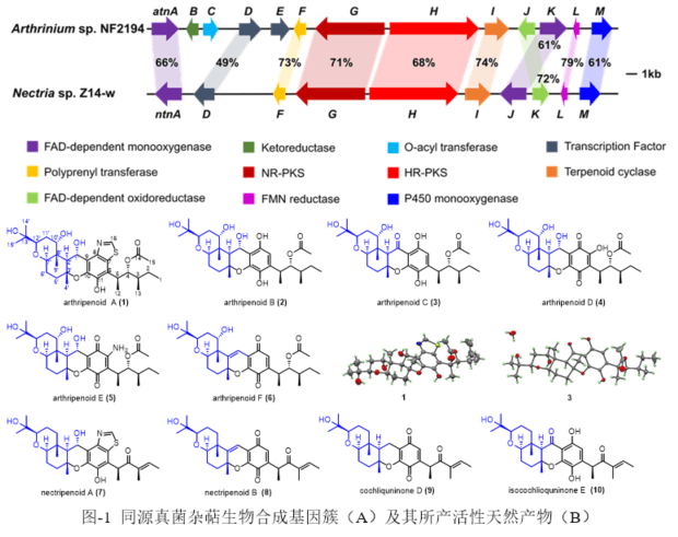 研究表明,真菌的聚酮杂萜是一类结构复杂、活性显著的天然产物,这类化合物在生物合成上的特点是编码聚酮合成酶和萜类合成酶的基因在物理距离上非常相近,往往聚集成簇(基因簇)。利用此特点,研究组从两株真菌Arthrinium sp. NF2194和Nectria sp. Z14-w中分析并鉴定出两个高度同源的杂萜生物合成基因簇(atn和ntn)(图-1A)。为获得这两个基因簇所编码的天然产物,他们利用RT-PCR对不同培养基发酵下两基因簇的表达量进行分析,选择表达量最高的条件进行大规模发酵,最终分离鉴定10个杂萜分子(图-1B),其中名为arthripenoid C的化合物具有较强的免疫抑制活性。
