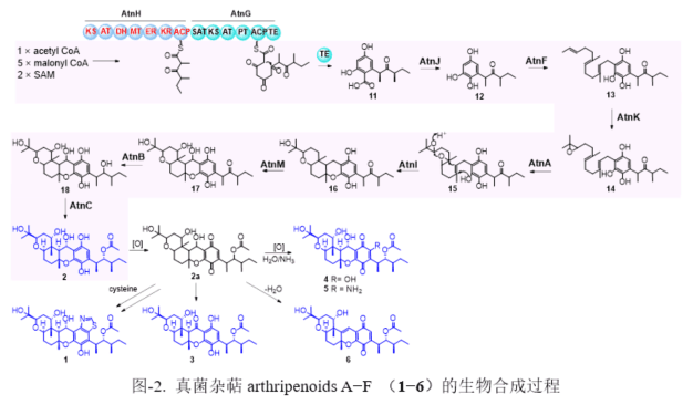 此外,通过对基因簇合成基因的分析,综合分子生物学、生物化学和有机化学等多学科的研究手段,他们完整阐明了此类新型真菌杂萜在生物体内的组装过程。研究表明,这两株真菌所产杂萜的形成有非常相似的生物合成过程,均通过高度还原型聚酮合成酶(HR-PKS)和非还原型聚酮合成酶(NR-PKS)的相互协作合成一链状芳香聚酮;然后通过一黄素依赖的脱羧氧化酶,脱去苯环上的羧基并原位产生羟基;再经法尼基转移酶转入萜链,然后连续的环氧化以及环化形成杂萜分子的共同骨架;此后,经氧化、酮基还原、乙酰化等不同的后修饰过程,构建出结构多样的杂萜分子(图-2)。该项研究,利用了杂萜型天然产物的生物合成特点,实现了该类化合物的高效基因挖掘,其中所展示的方法可推广至其它活性杂萜的发现。