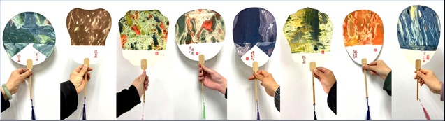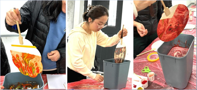 活动开始,指导老师首先介绍了漂漆扇的文化背景,大漆是中国最古老的工艺,中国是大漆的故乡,是世界漆艺的发祥地。接着,在老师的讲解带领下,大家初步认识了大漆,开始跃跃欲试,纷纷调漆,用色卡小心翼翼的试色。彩漆漂浮在水面上,只需将团扇慢慢放入水中,大漆就会随着水流附着在团扇,水因势而走的痕迹保留了下来,色彩穿插交错随机而成,流云变幻,尽显诗情画意之感,精致演绎了中国传统美学。