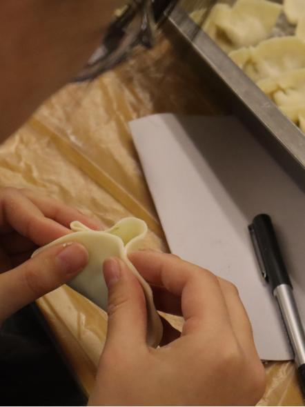 伴随着欢快的音乐,活动正式开始。同学们三五成群,欢声笑语不断,迫不及待地包起了饺子,很快各种形状的饺子就做好了。以前没包过饺子的同学们,在周围同学的指点下,也渐渐熟练起来,做出了漂亮的饺子。