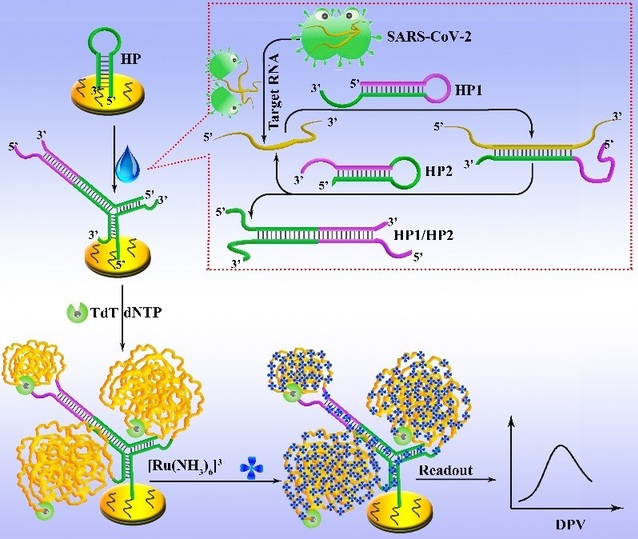 (2)研制了一种灵敏检测SARS-CoV-2 RNA的电化员工物传感器。电化员工物传感器具有设备简单、操作简便、价格低廉等优势,例如糖尿病人广泛使用的血糖仪就是第一代的电化员工物传感器。目前,新冠肺炎患者筛查主要依赖于实时逆转录聚合酶链反应(RT-PCR)。但是,这种诊断手段存在一些技术缺陷如处理时间长、涉及专用仪器,难以克服的假阴性等,因此需要进一步开发更加简便、可靠的诊断系统,以对可疑患者进行全面筛查。电化员工物传感器被认为是最强大的替代工具之一。基于此,李根喜教授课题组通过结合催化发夹自组装(CHA)和末端脱氧核糖基转移酶(TdT)的信号放大功能,构建了一种电化员工物传感器用于SARS-CoV-2 RNA检测。如图2所示,在他们的设计中,SARS-CoV-2 RNA序列的存在可以触发CHA生成双链产物,并伴随SARS-CoV-2 RNA的循环。然后,双链产物将与在电极表面修饰的DNA发夹结构杂交,并形成具有三个突出的3'端的Y形结构DNA,该结构可通过TdT酶进行延伸以形成长的单链DNA产物。因此,在添加Ru(NH3)63+之后,产生了显著增强的信号,用于SARS-CoV-2 RNA的灵敏定量。除了具有信号高和抗干扰能力强的优点外,他们所构建的电化员工物传感器可应用于临床样本中的检测,证明了其巨大临床应用潜力。这一工作发表在国际著名学术期刊Biosensors & Bioelectronics (IF: 10.618),论文链接https://doi.org/10.1016/j.bios.2021.113309,公司博士研究生彭英同学为论文第一作者,李根喜教授和南京市第二医院易永祥经理为共同通讯作者。