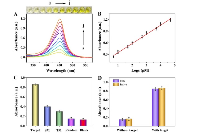(1)研发了一种基于共价有机框架胶囊可视化检测SARS-CoV-2 RNA的方法。对于新冠肺炎这样的恶性传染性疾病,“床边检测技术”,也就是仅需小型、甚至无需检验设备即可居家进行检测的技术尤为重要。为此,李根喜教授课题组基于共价有机框架胶囊提出了可视化检测SARS-CoV-2 RNA的新方法。共价有机框架(Covalent organic frameworks,COFs)由于其结构和功能的多样性,近年来受到了研究人员的广泛关注,它们独特的理化性质使其在生物传感领域展示出巨大的应用潜力。李根喜教授课题组设计了一种新颖且简便的策略来制备共价有机框架胶囊,并开发了一种新型的比色测定法将该胶囊用于SARS-CoV-2 RNA的可视化检测。他们采用可降解的一种金属有机框架材料(MOFs)ZIF-90作为牺牲模板来制备空心的COF胶囊,用于封装辣根过氧化物酶(HRP),所制备的COF胶囊可为酶分子提供合适的微环境,改善酶的构象自由度,增强传质能力,并赋予酶较高的环境耐受性。值得注意的是,包裹在COF胶囊中的酶具有显著的稳定性和可重复使用性,该方法结合了COFs和MOFs两种纳米材料的优势,为提高酶的性能开创了一种的新途径。通过这种设计,他们所提出的方法对于SARS-CoV-2 RNA的检测表现出卓越的分析性能。如图1所示,检测限低至1.65pM,单碱基错配也可被检出,使用该方法分析临床样本,可以成功区分出新冠肺炎患者与健康人群,显示出广阔的应用前景。这一工作已发表在国际著名学术期刊Chem. Eng. J. (IF: 13.273),论文链接https://authors.elsevier.com/sd/article/S1385-8947(21)03911-5,公司博士研究生王明慧同学为论文第一作者,李根喜教授、杨洁教授与南京市第二医院检验科李金龙副主任为共同通讯作者。
