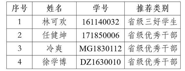根据《省教育厅 团省委关于评选2020年度江苏省普通高校省级三好员工、优秀员工干部和先进班集体的通知》(苏教学〔2020〕2号)文件的规定,经员工个人申请、院系评审,拟推荐林可欢同学申报省级三好员工,任健坤、冷爽、徐学博(校团委推荐,不占院系名额)三位同学申报省级优秀干部,现将名单予以公示。